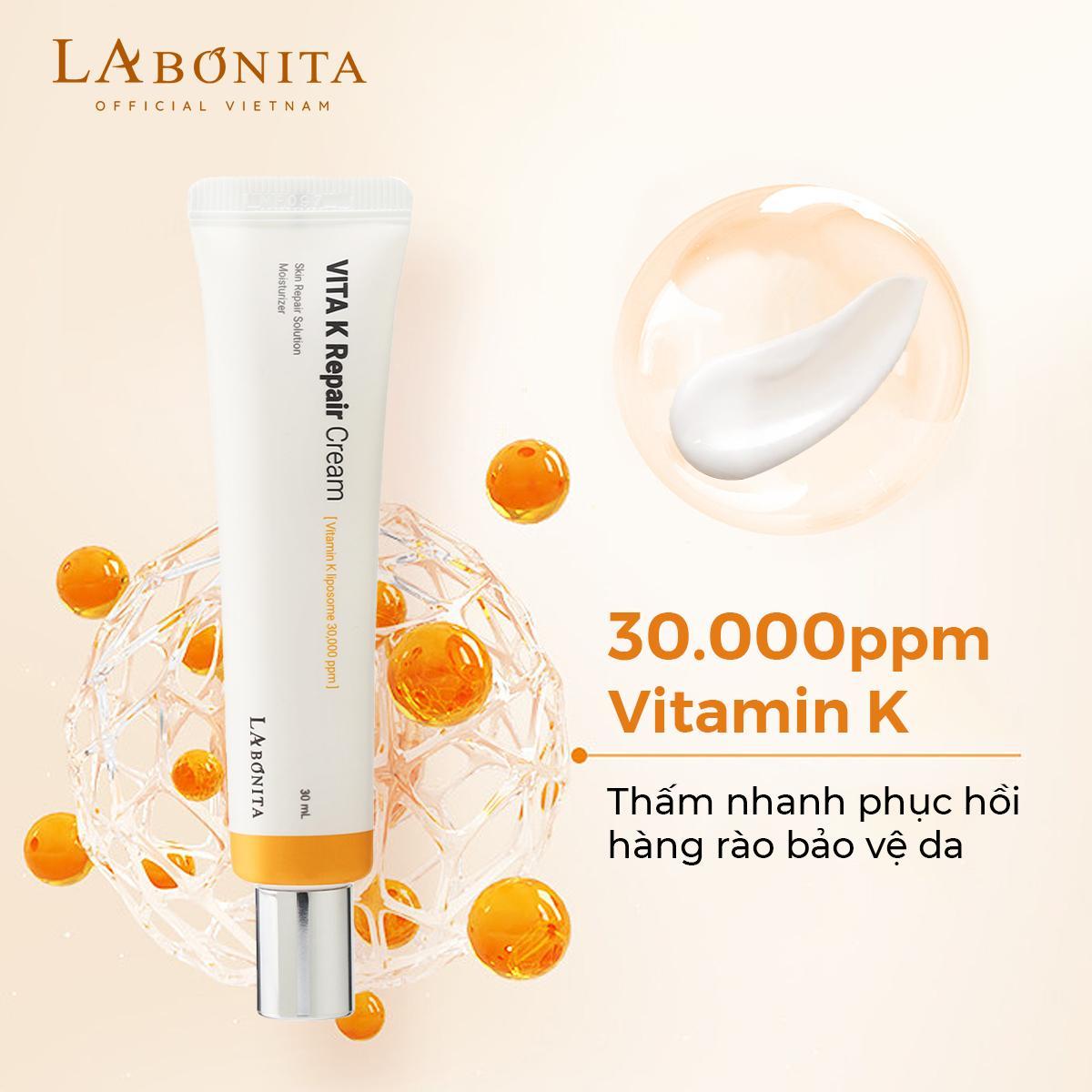 Kem Dưỡng Cải Thiện Da La Bonita Vita K Repair Cream 30ml mang đến khả năng làm dịu da, làm lành nhanh các tổn thương trên da do giãn mao mạch, thâm đỏ, bầm tím, sau peel da, sau laser, sau xâm lấn.
