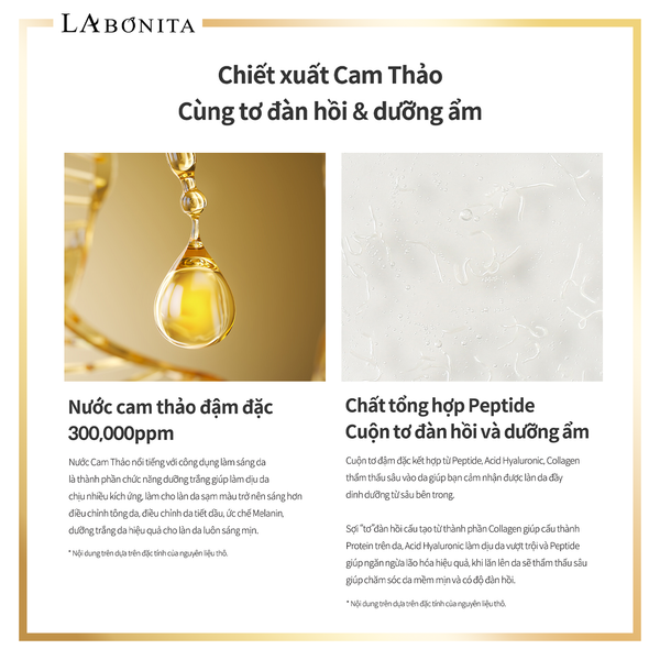 La Bonita Brightening Blemish Ampoule chiết xuất từ thành phần rễ cây cam thảo kết hợp với 2% Niacinamide, Alpha Arbutin hiệu quả trong dưỡng sáng da, ức chế tyrosinase và do đó ngăn chặn sự hình thành của sắc tố melanin.